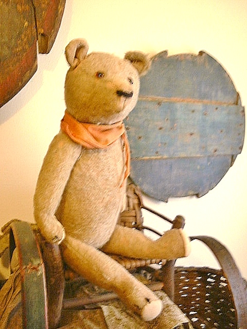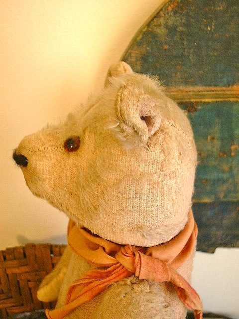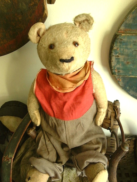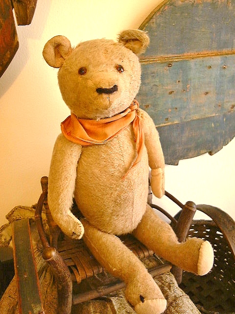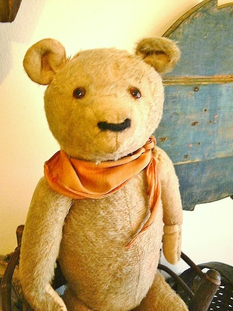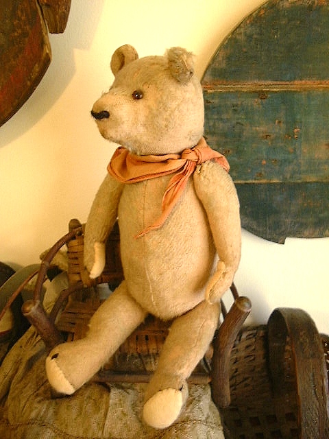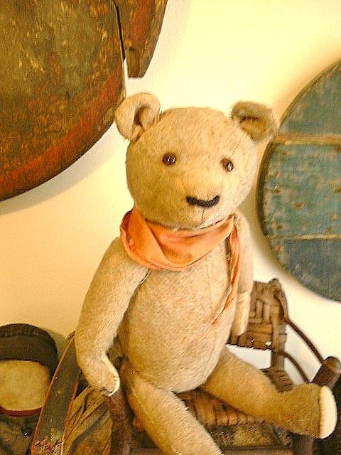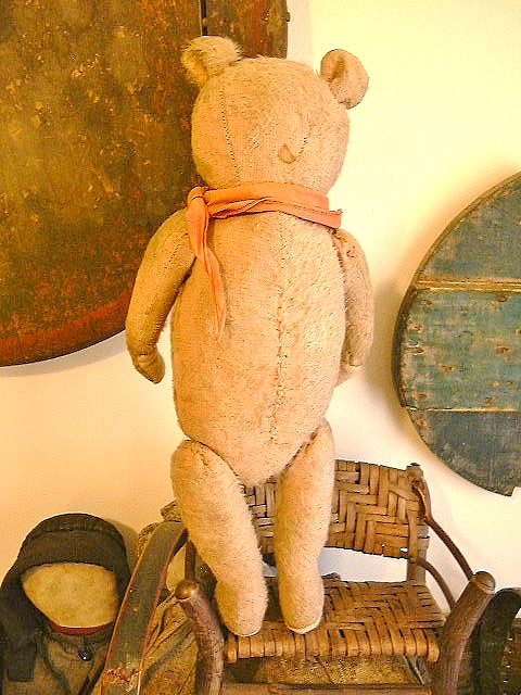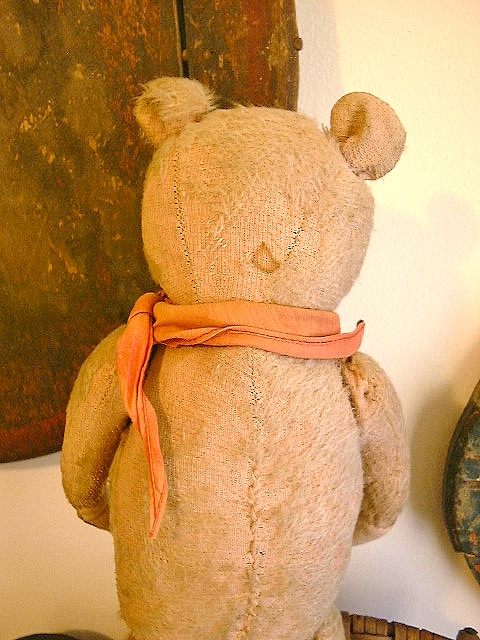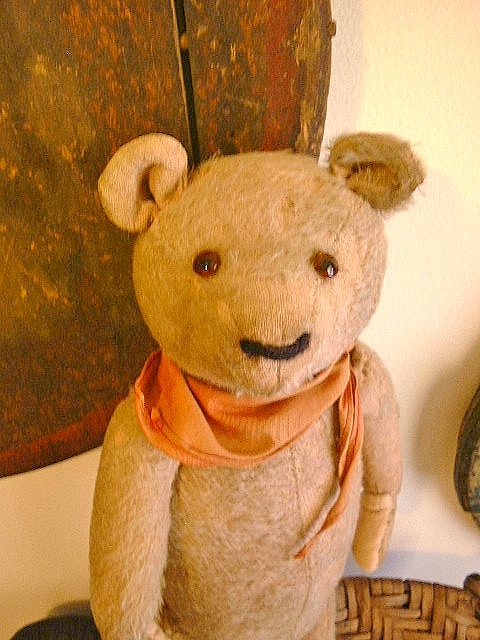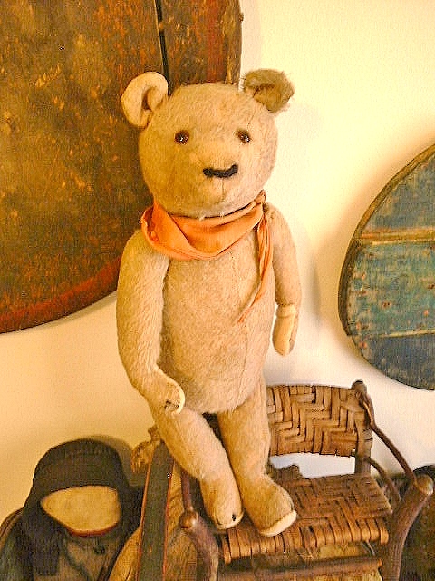 Dear Old Hank, a chunky early Teddy filled with personality and a friendly face, likely American around 1930s or possibly German Petz with those set in ears and amber glass eyes. He measures 16” and comes in “as found condition” with a light coating of shelf dust, some patina from being dragged with Love through the years and a little bit of his beige mohair left.