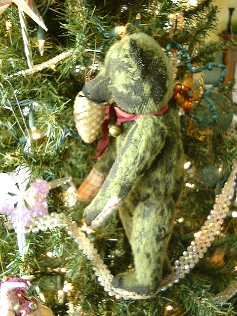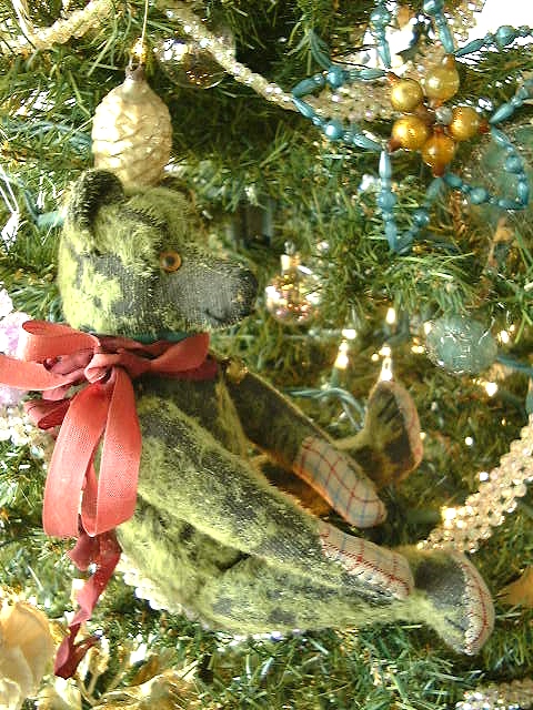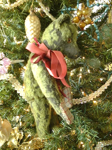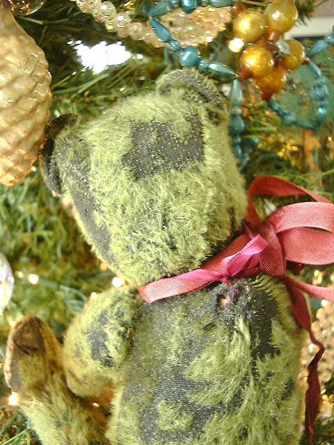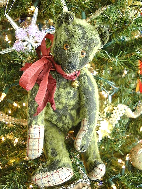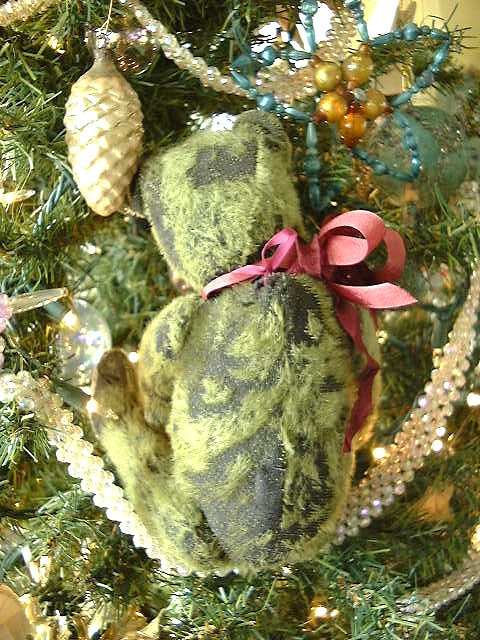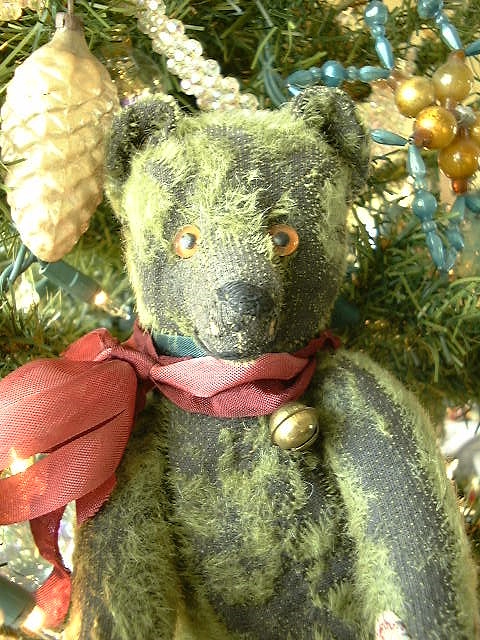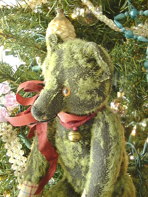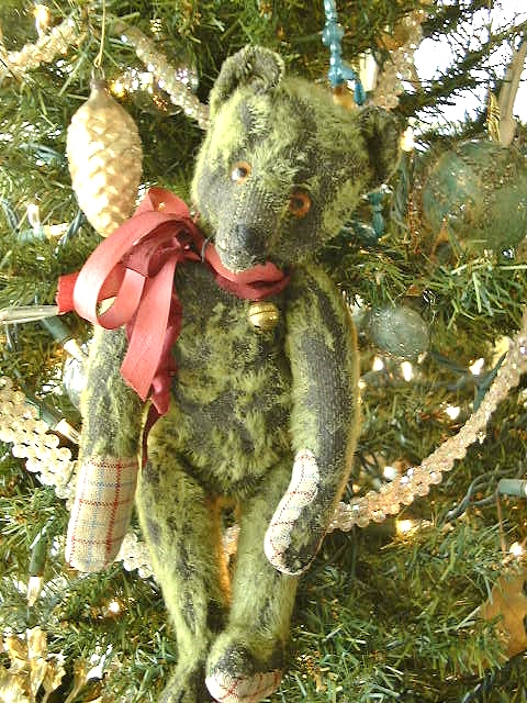 Tucked away is our hidden jewel, a rarely seen colored early BING Sentry teddy bear of dark spruce green mohair from 1920s or slightly earlier, measuring 11 1/2" tall to top of head.