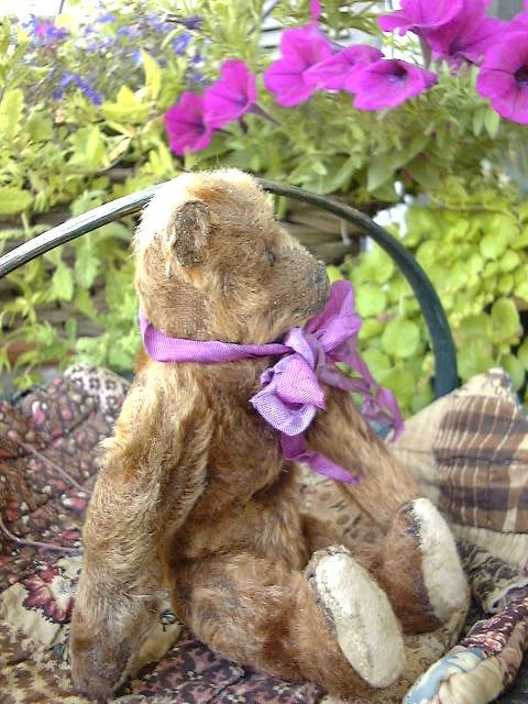Worn from Love, his vibrant cinnamon mohair has good overall coverage with about 50% maybe more remaining. He has areas of missing mohair & sagging in his belly, arms & legs where the kapok & straw has settled over time. His foot pads have been repaired.