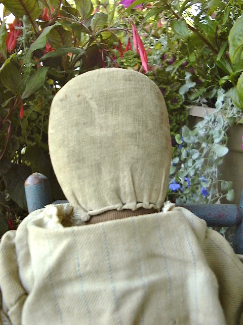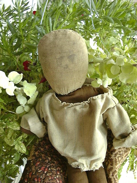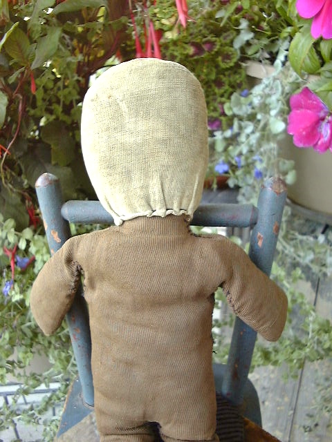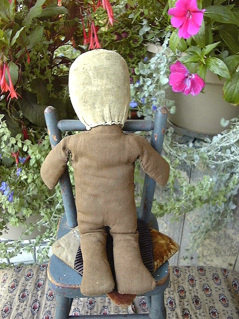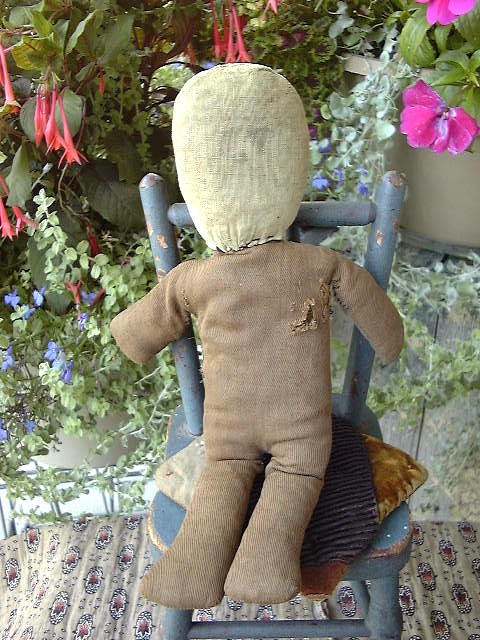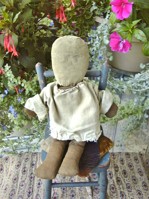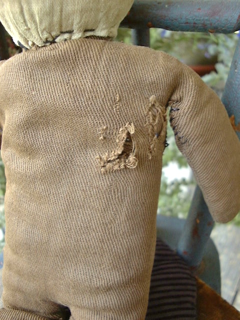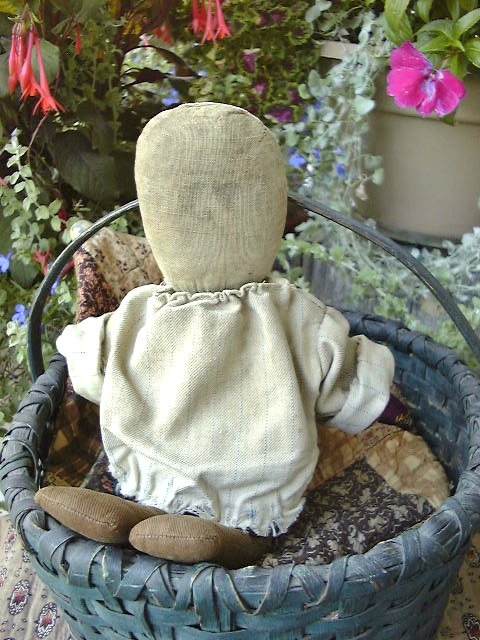 Summertime…and the Livin’ is Easier! Offering our sweet old boy for adoption, a wonderful make-do early cloth doll likely stuffed with old batting or cloth pieces found around the home. He has a face drawn in pencil and the backside I almost see another one though quite worn but perhaps just my great imagination or aging vision.