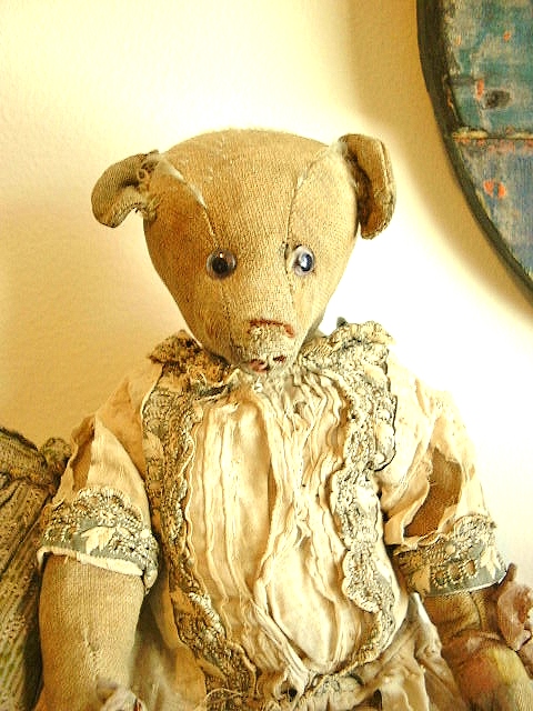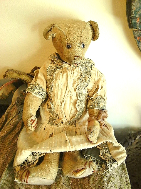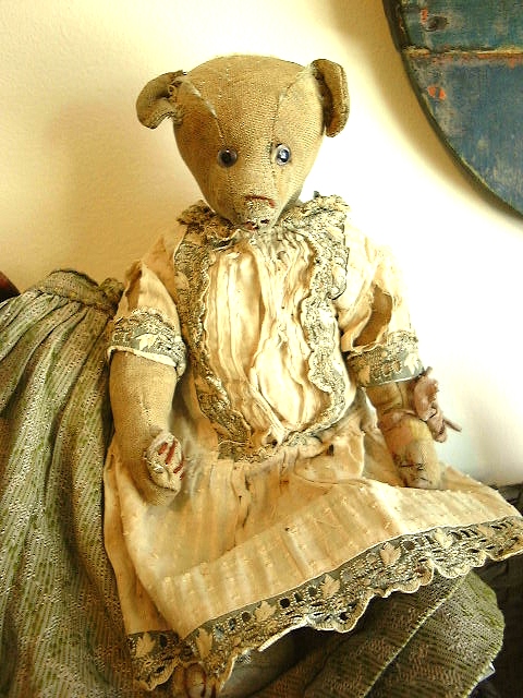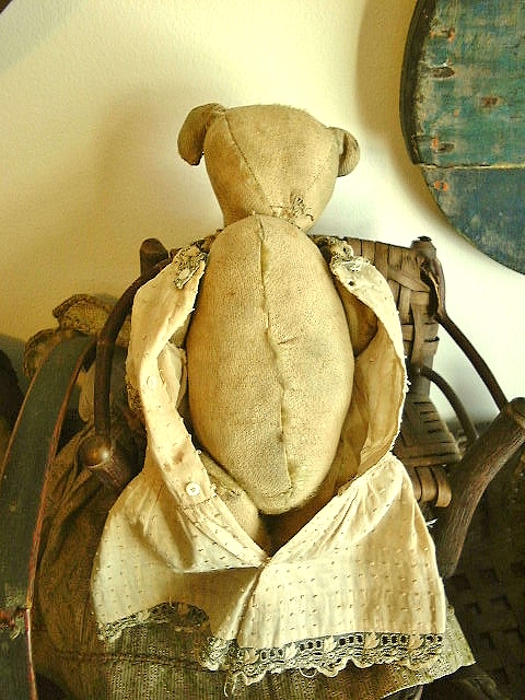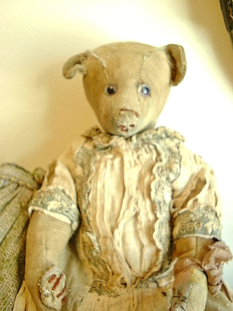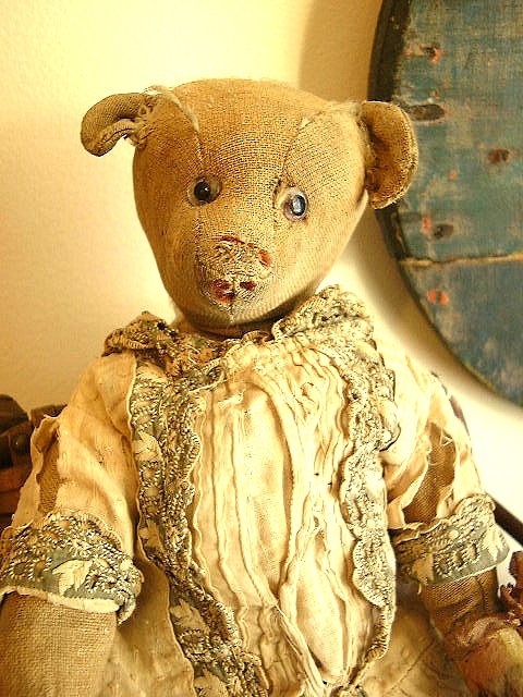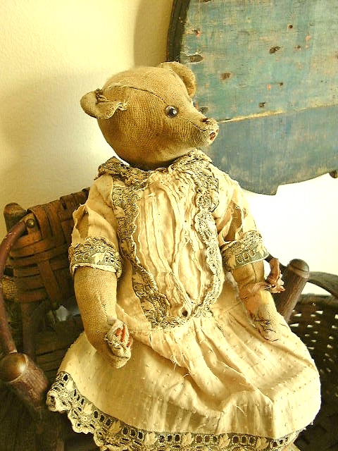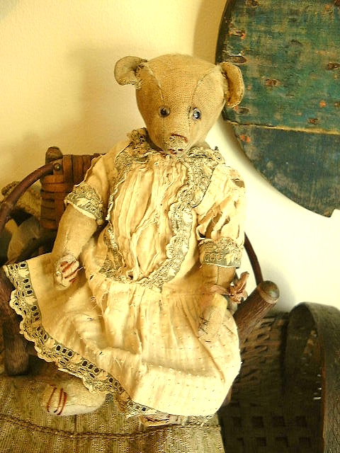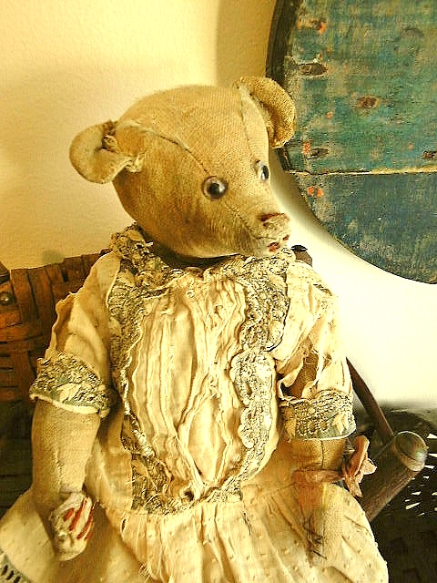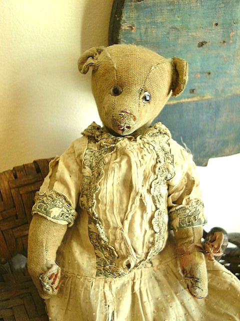 Helga isn’t the prettiest of gals and has had much Love, age related wear and balding. Her glass eyes are original as is her worn away bits of rust color nose floss, soft spoken mouth is invisible and she has most of her claws if not all of them.