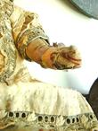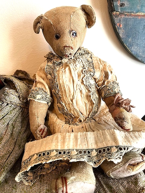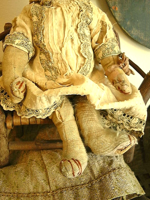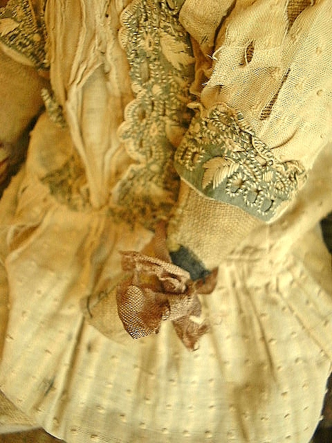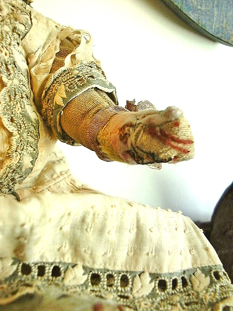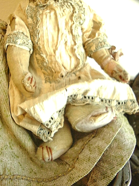 She wears an early antique palest pinky beige dress with mushroom color lace trim. Her once gorgeous dress is now quite fragile and splitting in areas so we haven’t tried to remove it, though it does face up fairly well enough for her, holding its own and possibly?? could be mended.