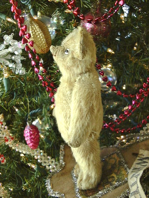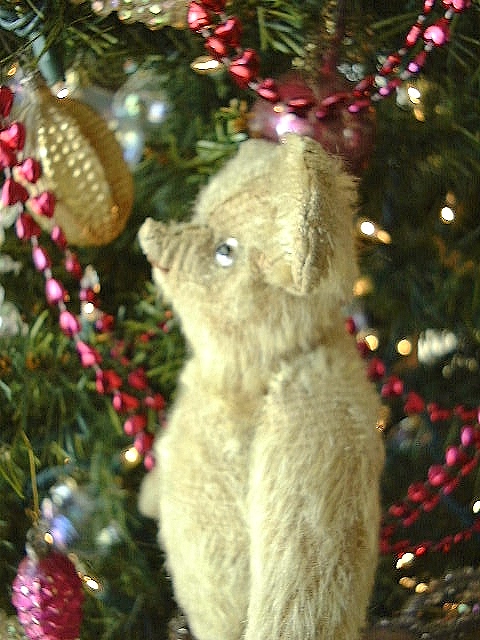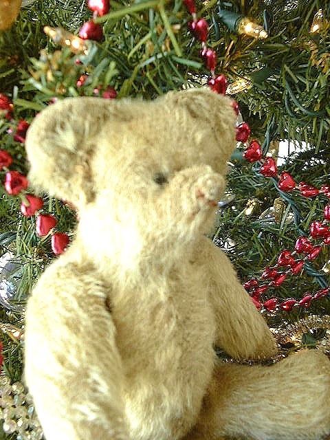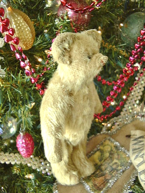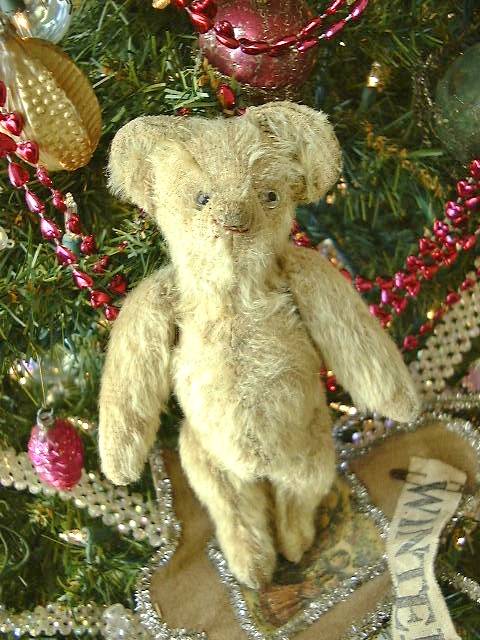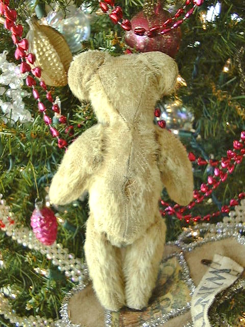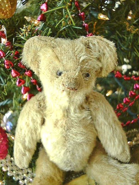 Overall wear to his once fluffy blonde mohair. Original clear glass eyes, one is pushed further in and the other seems slightly bent, he’s definitely a bit quirky. A faded smidgeon of his rust color floss mouth remains below his somewhat sucked on, twisted nose. A small opening shows in the seam of his back. He’s not had a bath as yet but it would brighten up his remaining fur.