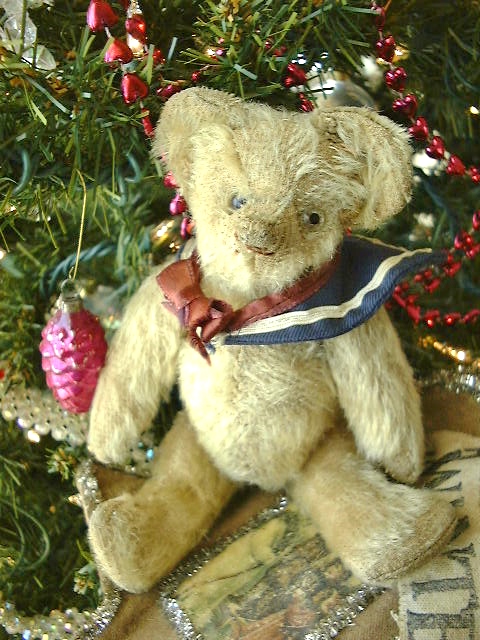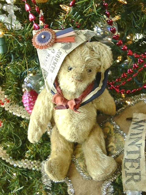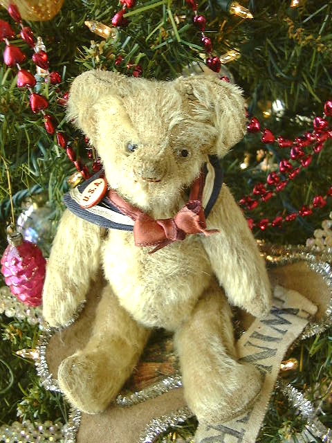 Vintage sailor collar with early rosette pin and handmade hat complete his already endearing look. A wonderfully expressive face, give him a hug and make him your Valentine.